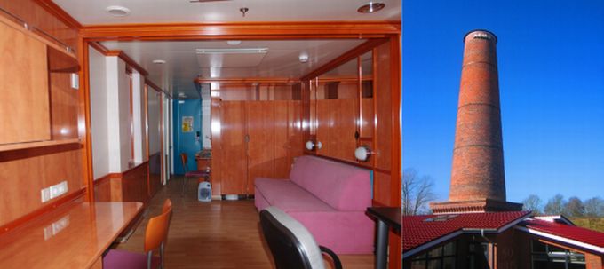 ![]() | Eine Schiffskabine aus einem Kreuz- fahrtschiff ist eines unserer Büros Der Schornstein ist unser Wahrzeichen |