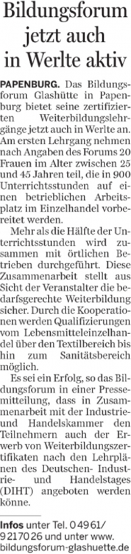 06.12.2009 Zulassung Bildungsmaßnahmen 14.01.2010 Bilungsforum Glashütte: Zweigstelle Werlte, IHK-Zertifikate Der Wecker 17.01.2010 Zweigstelle in Werlte, IHK-Zertifikate Ems-Zeitung 20.01.2010 Zweigstelle in Werlte, IHK Zertifikate